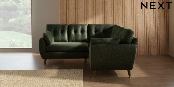 7.3.1 Buy Wilson Buttoned Back Small Corner Sofa - Universal Boucle Chenille Dark Moss Green Low Retro Tapered Metal Cap - Mid from the Seasons online shop Click here to use our website with more accessibility support, for example screen readers