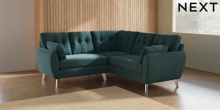 7.3.1 Buy Wilson Buttoned Back Small Corner Sofa - Universal Chunky Chenille Mid Teal Green Metal Tapered - Chrome from the Seasons online shop Click here to use our website with more accessibility support, for example screen readers