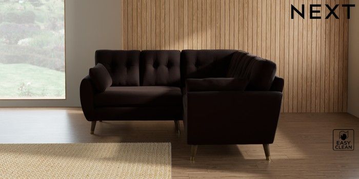 7.3.1 Buy Wilson Buttoned Back Small Corner Sofa - Universal Fine Chenille Easy Clean Chocolate Brown Low Retro Tapered Metal Cap - Mid from the Seasons online shop Click here to use our website with more accessibility support, for example screen readers