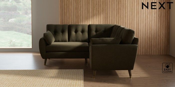 7.3.1 Buy Wilson Buttoned Back Small Corner Sofa - Universal Fine Chenille Easy Clean Dark Moss Green Low Retro Tapered Metal Cap - Mid from the Seasons online shop Click here to use our website with more accessibility support, for example screen readers