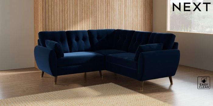 7.3.1 Buy Wilson Buttoned Back Small Corner Sofa - Universal Plush Velvet Easy Clean Navy Blue Low Retro Tapered Metal Cap - Mid from the Seasons online shop Click here to use our website with more accessibility support, for example screen readers