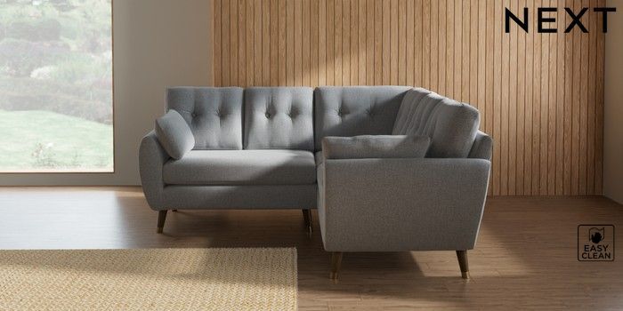 7.3.1 Buy Wilson Buttoned Back Small Corner Sofa - Universal Tweedy Blend Easy Clean Light Silver Grey Low Retro Tapered Metal Cap - Mid from the Seasons online shop Click here to use our website with more accessibility support, for example screen readers