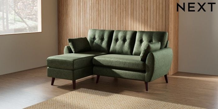 7.3.1 Buy Wilson Buttoned Back Small Sofa Chaise - Left Hand Boucle Chenille Dark Moss Green Retro Tapered - Dark Brown from the Seasons online shop Click here to use our website with more accessibility support, for example screen readers