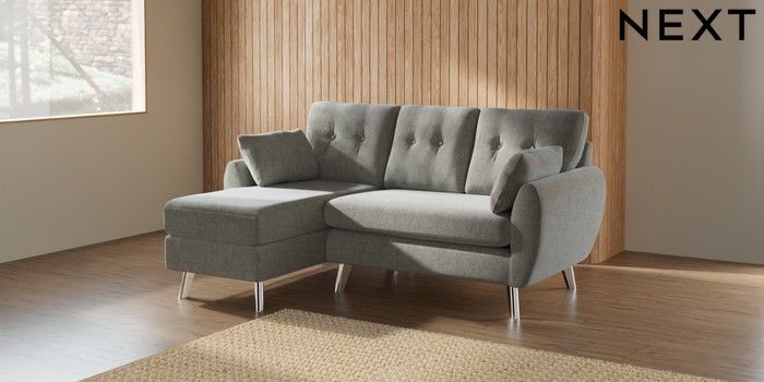 7.2.10 Buy Wilson Buttoned Back Small Sofa Chaise - Left Hand Chunky Chenille Light Grey Metal Tapered - Chrome from the Seasons online shop Click here to use our website with more accessibility support, for example screen readers