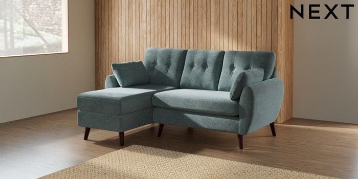 7.3.1 Buy Wilson Buttoned Back Small Sofa Chaise - Left Hand Chunky Chenille Light Teal Green Retro Tapered - Dark Brown from the Seasons online shop Click here to use our website with more accessibility support, for example screen readers