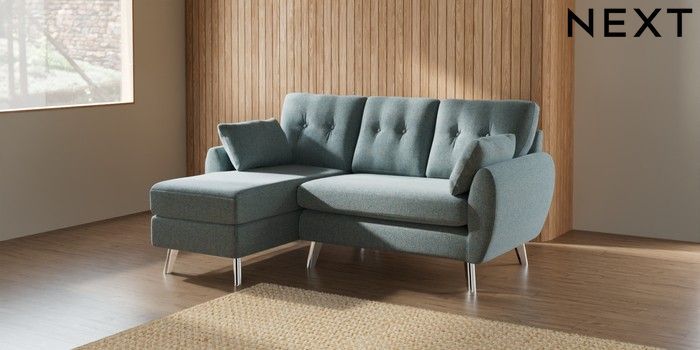 7.3.1 Buy Wilson Buttoned Back Small Sofa Chaise - Left Hand Chunky Marl Mid Blue Metal Tapered - Chrome from the Seasons online shop Click here to use our website with more accessibility support, for example screen readers