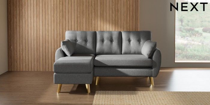 7.3.1 Buy Wilson Buttoned Back Small Sofa Chaise - Left Hand Chunky Weave Mid Grey Metal Tapered - Gold from the Seasons online shop Click here to use our website with more accessibility support, for example screen readers