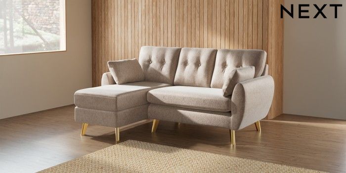 7.3.1 Buy Wilson Buttoned Back Small Sofa Chaise - Left Hand Cotswold Chenille Light Natural Metal Tapered - Gold from the Seasons online shop Click here to use our website with more accessibility support, for example screen readers