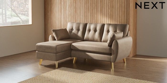 7.3.1 Buy Wilson Buttoned Back Small Sofa Chaise - Left Hand Luxe Chenille Mid Camel Beige Metal Tapered - Gold from the Seasons online shop Click here to use our website with more accessibility support, for example screen readers