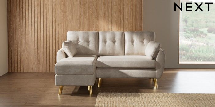 7.3.1 Buy Wilson Buttoned Back Small Sofa Chaise - Left Hand Plush Chenille Oyster Metal Tapered - Gold from the Seasons online shop Click here to use our website with more accessibility support, for example screen readers