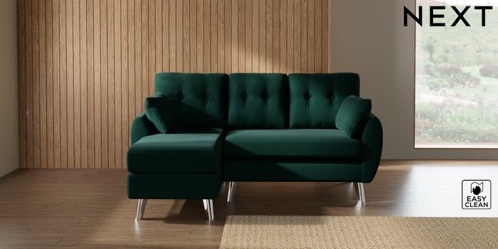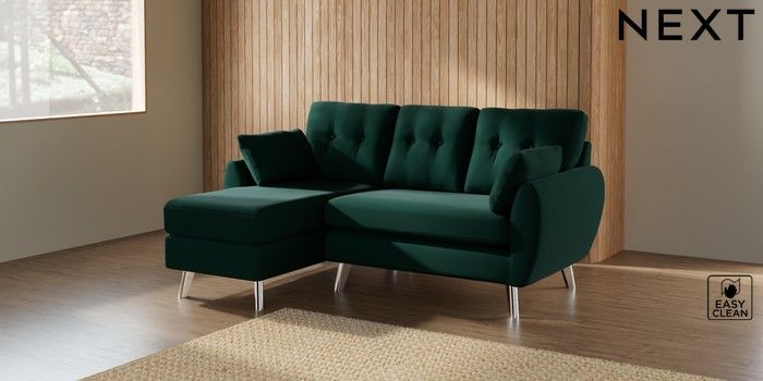 7.3.1 Buy Wilson Buttoned Back Small Sofa Chaise - Left Hand Plush Velvet Easy Clean Bottle Green Metal Tapered - Chrome from the Seasons online shop Click here to use our website with more accessibility support, for example screen readers