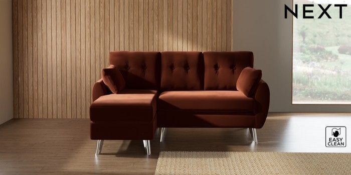 7.3.1 Buy Wilson Buttoned Back Small Sofa Chaise - Left Hand Plush Velvet Easy Clean Ginger Orange Metal Tapered - Chrome from the Seasons online shop Click here to use our website with more accessibility support, for example screen readers