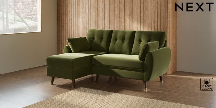7.3.1 Buy Wilson Buttoned Back Small Sofa Chaise - Left Hand Plush Velvet Easy Clean Mid Olive Green Low Retro Tapered Metal Cap - Mid from the Seasons online shop Click here to use our website with more accessibility support, for example screen readers