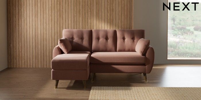 7.3.1 Buy Wilson Buttoned Back Small Sofa Chaise - Left Hand Relaxed Linen Look Light Rust Brown Low Retro Tapered Metal Cap - Mid from the Seasons online shop Click here to use our website with more accessibility support, for example screen readers