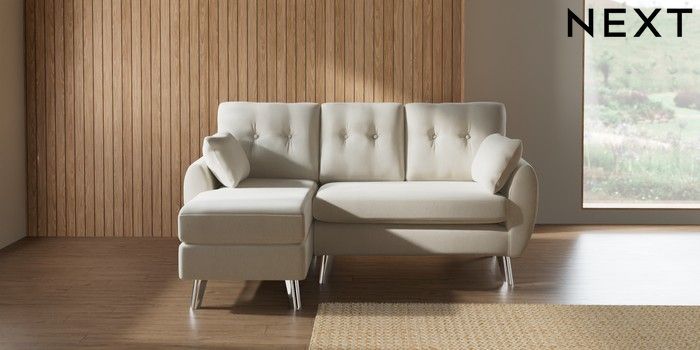7.3.1 Buy Wilson Buttoned Back Small Sofa Chaise - Left Hand Relaxed Linen Look Oyster Metal Tapered - Chrome from the Seasons online shop Click here to use our website with more accessibility support, for example screen readers