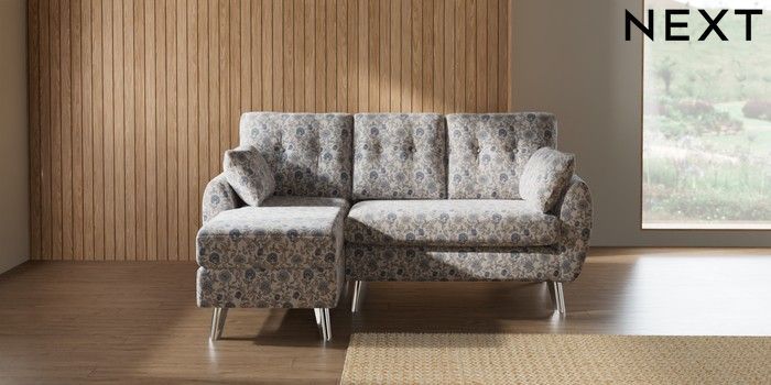 7.3.1 Buy Wilson Buttoned Back Small Sofa Chaise - Left Hand Relaxed Linen Look Print Woodblock Floral Blue Metal Tapered - Chrome from the Seasons online shop