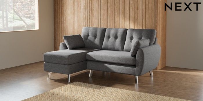 7.2.10 Buy Wilson Buttoned Back Small Sofa Chaise - Left Hand Studio Chenille Mid Grey Metal Tapered - Chrome from the Seasons online shop Click here to use our website with more accessibility support, for example screen readers
