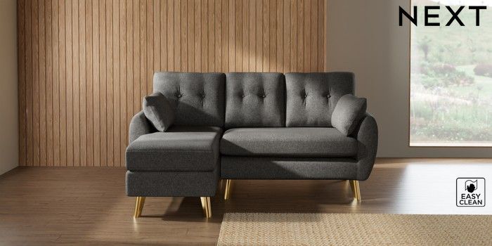 7.3.1 Buy Wilson Buttoned Back Small Sofa Chaise - Left Hand Tweedy Blend Easy Clean Dark Grey Metal Tapered - Gold from the Seasons online shop Click here to use our website with more accessibility support, for example screen readers