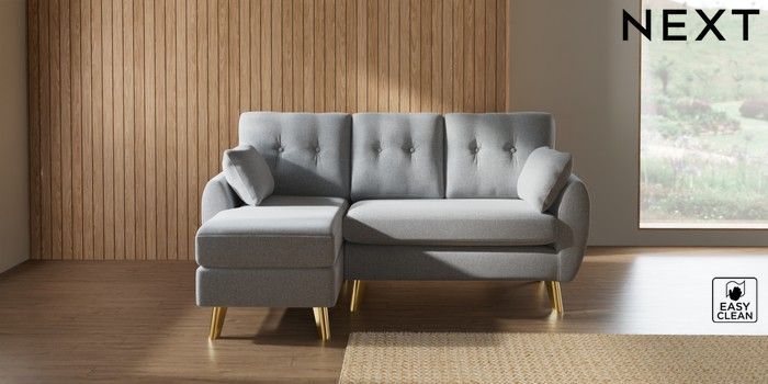 7.3.1 Buy Wilson Buttoned Back Small Sofa Chaise - Left Hand Tweedy Blend Easy Clean Light Silver Grey Metal Tapered - Gold from the Seasons online shop Click here to use our website with more accessibility support, for example screen readers