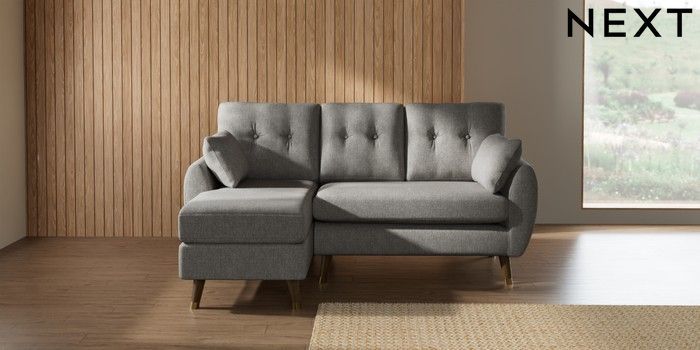 7.3.1 Buy Wilson Buttoned Back Small Sofa Chaise - Left Hand Tweedy Chenille Mid Grey Low Retro Tapered Metal Cap - Mid from the Seasons online shop Click here to use our website with more accessibility support, for example screen readers