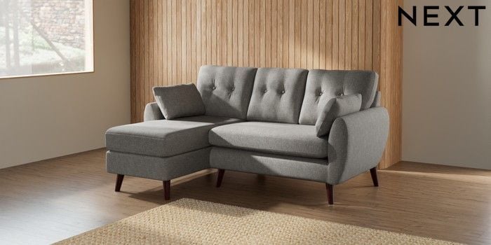 7.3.1 Buy Wilson Buttoned Back Small Sofa Chaise - Left Hand Tweedy Chenille Mid Grey Retro Tapered - Dark Brown from the Seasons online shop Click here to use our website with more accessibility support, for example screen readers