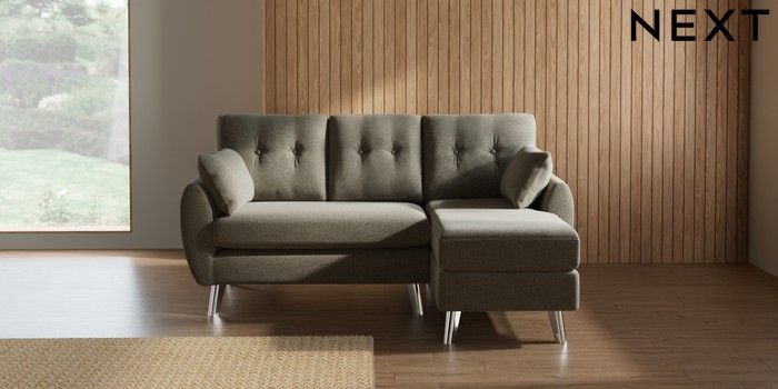 7.3.1 Buy Wilson Buttoned Back Small Sofa Chaise - Right Hand Chunky Marl Light Olive Green Metal Tapered - Chrome from the Seasons online shop Click here to use our website with more accessibility support, for example screen readers