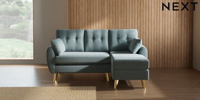 7.3.1 Buy Wilson Buttoned Back Small Sofa Chaise - Right Hand Chunky Marl Mid Blue Metal Tapered - Gold from the Seasons online shop Click here to use our website with more accessibility support, for example screen readers