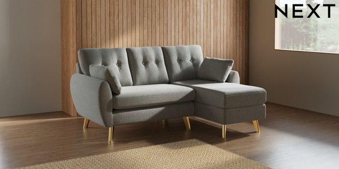 7.3.1 Buy Wilson Buttoned Back Small Sofa Chaise - Right Hand Chunky Texture Dove Metal Tapered - Gold from the Seasons online shop Click here to use our website with more accessibility support, for example screen readers