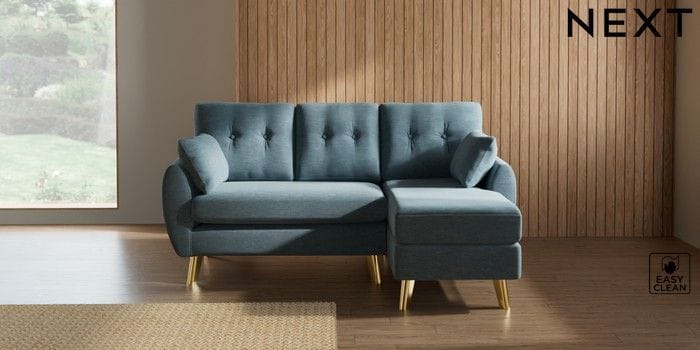 7.3.1 Buy Wilson Buttoned Back Small Sofa Chaise - Right Hand Fine Chenille Easy Clean Mid Blue Metal Tapered - Gold from the Seasons online shop Click here to use our website with more accessibility support, for example screen readers