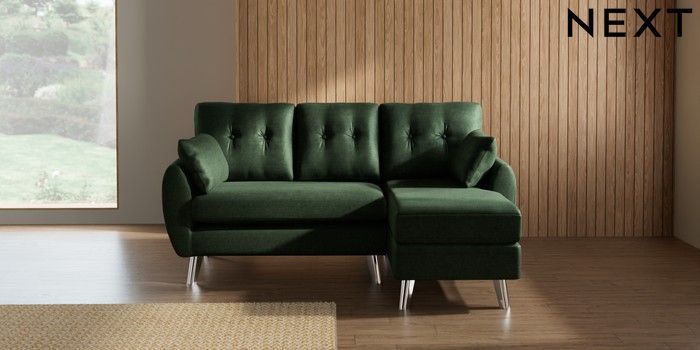 7.3.1 Buy Wilson Buttoned Back Small Sofa Chaise - Right Hand Luxe Chenille Dark Green Metal Tapered - Chrome from the Seasons online shop Click here to use our website with more accessibility support, for example screen readers