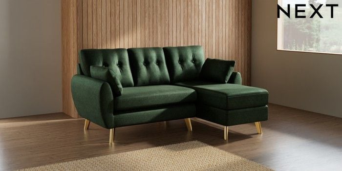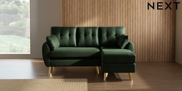 7.3.1 Buy Wilson Buttoned Back Small Sofa Chaise - Right Hand Luxe Chenille Dark Green Metal Tapered - Gold from the Seasons online shop Click here to use our website with more accessibility support, for example screen readers