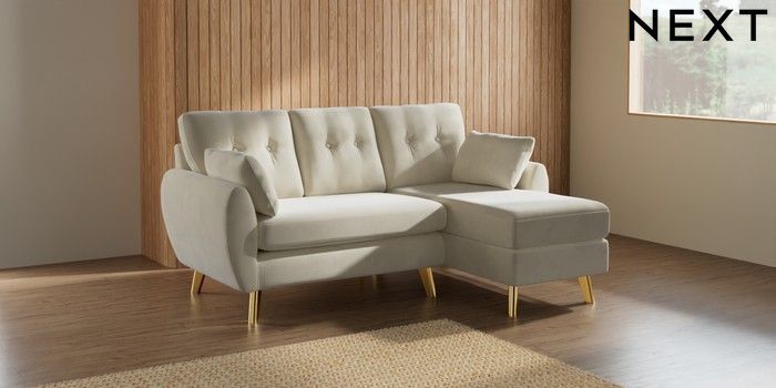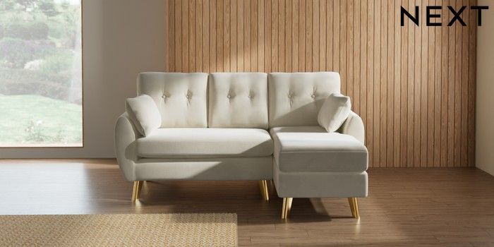 7.3.1 Buy Wilson Buttoned Back Small Sofa Chaise - Right Hand Luxe Chenille Oyster Metal Tapered - Gold from the Seasons online shop Click here to use our website with more accessibility support, for example screen readers