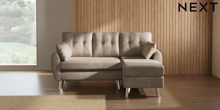 7.3.1 Buy Wilson Buttoned Back Small Sofa Chaise - Right Hand Plush Chenille Light Natural Metal Tapered - Chrome from the Seasons online shop Click here to use our website with more accessibility support, for example screen readers