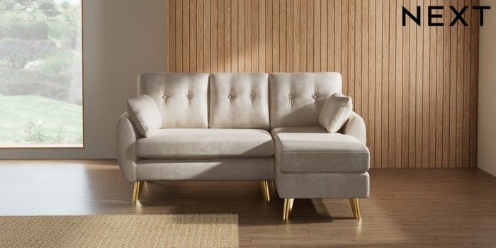 7.3.1 Buy Wilson Buttoned Back Small Sofa Chaise - Right Hand Plush Chenille Oyster Metal Tapered - Gold from the Seasons online shop Click here to use our website with more accessibility support, for example screen readers