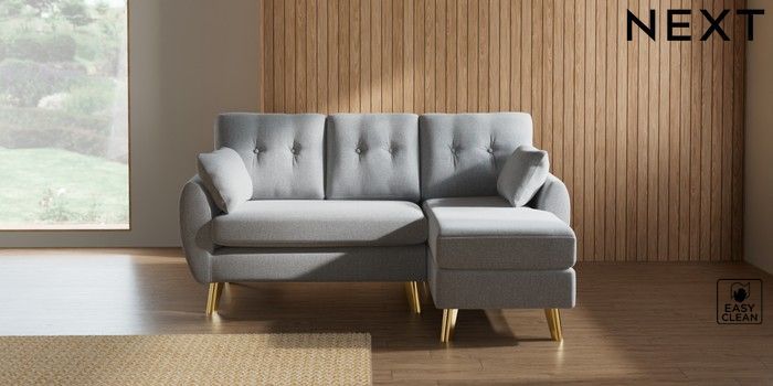 7.3.1 Buy Wilson Buttoned Back Small Sofa Chaise - Right Hand Tweedy Blend Easy Clean Light Silver Grey Metal Tapered - Gold from the Seasons online shop Click here to use our website with more accessibility support, for example screen readers