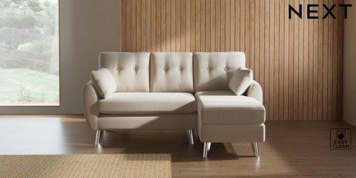 7.3.1 Buy Wilson Buttoned Back Small Sofa Chaise - Right Hand Tweedy Blend Easy Clean Oyster Metal Tapered - Chrome from the Seasons online shop Click here to use our website with more accessibility support, for example screen readers