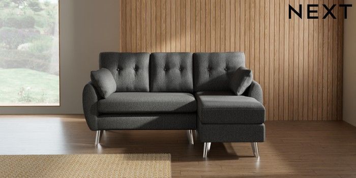 7.3.1 Buy Wilson Buttoned Back Small Sofa Chaise - Right Hand Tweedy Chenille Dark Grey Metal Tapered - Chrome from the Seasons online shop Click here to use our website with more accessibility support, for example screen readers