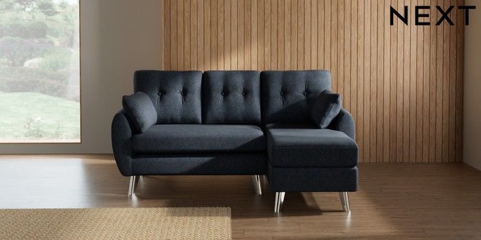 7.3.1 Buy Wilson Buttoned Back Small Sofa Chaise - Right Hand Tweedy Chenille Navy Blue Metal Tapered - Chrome from the Seasons online shop Click here to use our website with more accessibility support, for example screen readers
