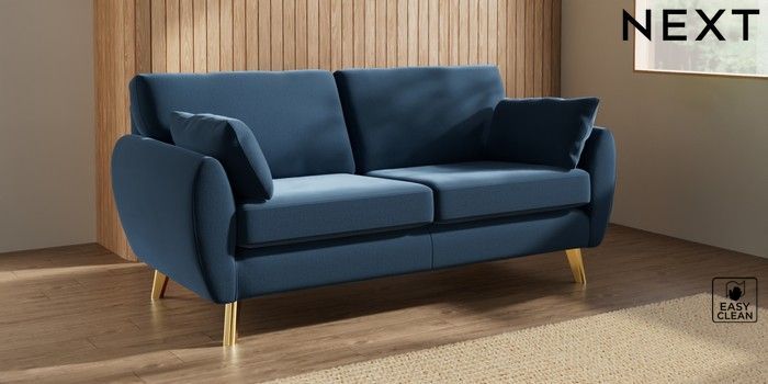 7.3.1 Buy Wilson 3 Seater Small Sofa Plush Velvet Easy Clean Airforce Blue Metal Tapered - Gold from the Seasons online shop