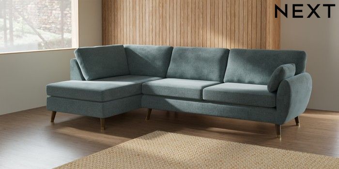 7.3.1 Buy Wilson Large Corner Chaise - Left Hand Chunky Chenille Light Teal Green Low Retro Tapered Metal Cap - Mid from the Seasons online shop Click here to use our website with more accessibility support, for example screen readers