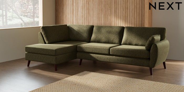 7.3.1 Buy Wilson Large Corner Chaise - Left Hand Cotswold Chenille Dark Green Retro Tapered - Dark Brown from the Seasons online shop Click here to use our website with more accessibility support, for example screen readers