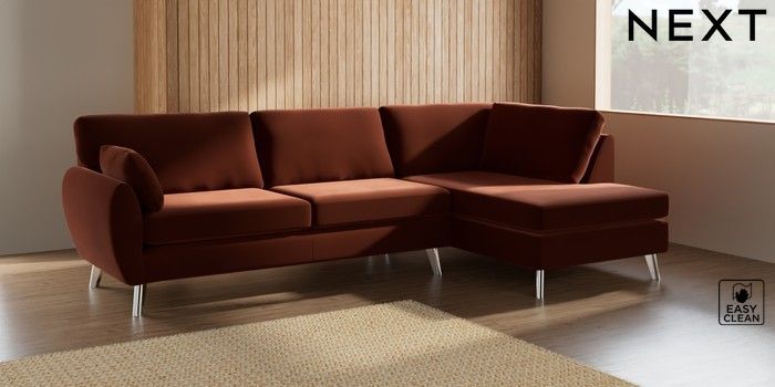 7.3.1 Buy Wilson Large Corner Chaise - Right Hand Plush Velvet Easy Clean Ginger Orange Metal Tapered - Chrome from the Seasons online shop