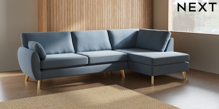 7.3.1 Buy Wilson Large Corner Chaise - Right Hand Relaxed Linen Look Mid Blue Metal Tapered - Gold from the Seasons online shop