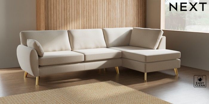 7.3.1 Buy Wilson Large Corner Chaise - Right Hand Tweedy Blend Easy Clean Oyster Metal Tapered - Gold from the Seasons online shop