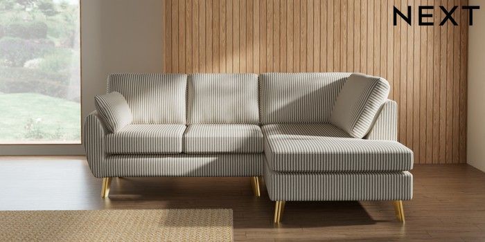 7.3.1 Buy Wilson Medium Corner Chaise - Right Hand Chenille Stripe Moss Green Metal Tapered - Gold from the Seasons online shop Click here to use our website with more accessibility support, for example screen readers