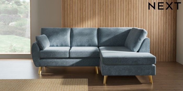 7.3.1 Buy Wilson Medium Corner Chaise - Right Hand Plush Chenille Light Blue Metal Tapered - Gold from the Seasons online shop Click here to use our website with more accessibility support, for example screen readers