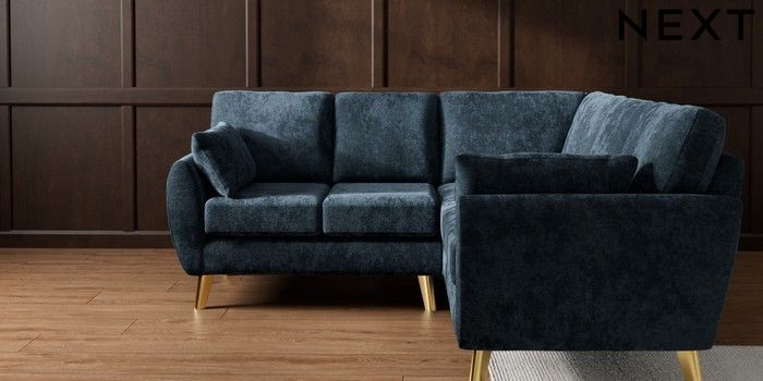 7.3.1 Buy Wilson Small Corner Sofa - Universal Distressed Velour Midnight Blue Metal Tapered - Gold from the Seasons online shop Click here to use our website with more accessibility support, for example screen readers