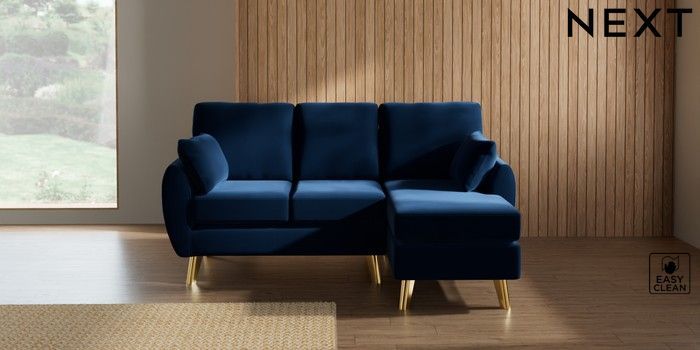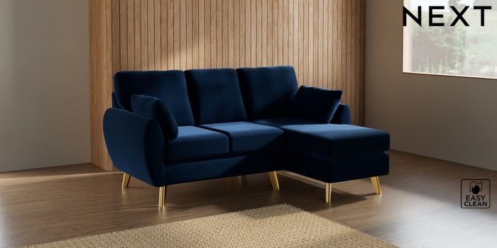 7.3.1 Buy Wilson Small Sofa Chaise - Right Hand Plush Velvet Easy Clean Navy Blue Metal Tapered - Gold from the Seasons online shop