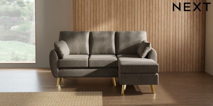 7.3.1 Buy Wilson Small Sofa Chaise - Right Hand Cotswold Chenille Mid Mink Brown Metal Tapered - Gold from the Seasons online shop Click here to use our website with more accessibility support, for example screen readers