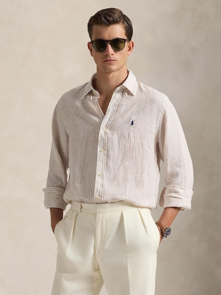 Coastal Beige & White Custom Fit Linen Stripe Shirt